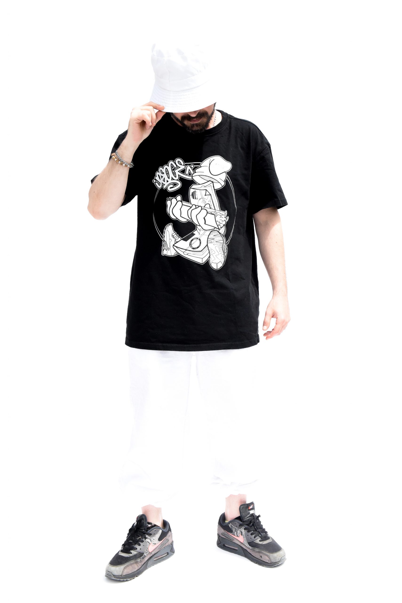 Teeshirt noir avec motif blanc cerclé sur la face avant. Taille Oversized.